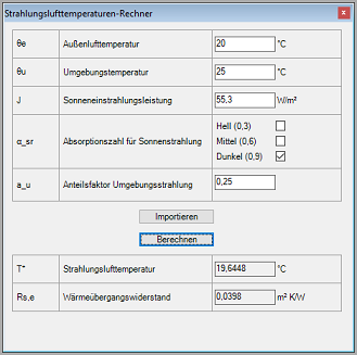 Die Strahlungslufttemperatur ist eine fiktive Temperatur, bei deren Verwendung sowohl der Einfluss der Sonneneinstrahlung als auch jener des langwelligen Strahlungsaustauschs berücksichtigt wird. Wird anstelle der Außenlufttemperatur in AnTherm die Strahlungslufttemperatur eingegeben, so bedeutet dies, dass nicht nur die Sonneneinstrahlung untertags sondern auch der langwellige Strahlungsaustausch zwischen den äußeren Oberflächen der Außenbauteile einerseits und sowohl dem Himmel als auch der terrestrischen Umgebung andererseits berücksichtigt werden. Die Verwendung der Strahlungslufttemperatur impliziert, dass die Absorptions- und Reflexionsvorgänge an den äußeren Bauteiloberflächen stattfinden. Das verwendete Verfahren vermag diese Vorgänge exakt wiederzugeben. Derzeit werden als äußere Randbedingungen für AnTherm Außenlufttemperaturen vom Benutzer eingegeben. Im stationären Fall ist dies jeweils ein Wert. Im instationären, periodisch eingeschwungenen Fall sind dies die 24 Werte eines Tagesgangs.