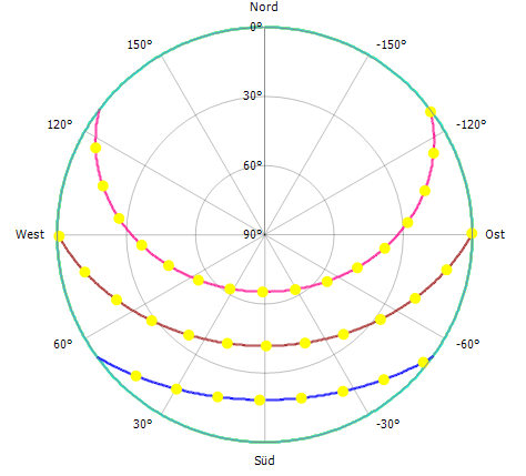 Sonnenbahnen im Polardiagramm (mit eingeblendeten Horizontüberhöhungen)