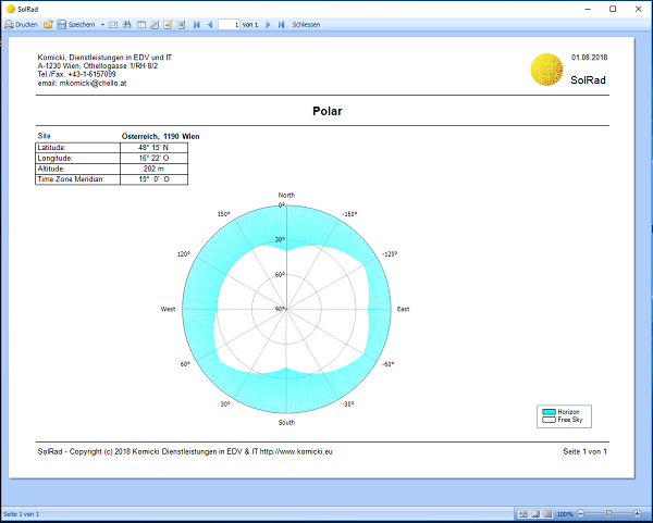 położenia Słońca (drogi Słońca), natężenia naświetlenia (natężenie promieniowania słonecznego) w odniesieniu do dowolnego położenia i nachylenia w kierunku ziemi oraz czasu trwania godziny słonecznej (ekspozycja na słońce) biorąc pod uwagę efekty cienia. (Zacienienie horyzontu-odbicie promieniowania.)