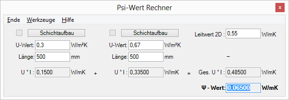 Bis zu zwei U-Wert/Länge-Paare können eingegeben werden. Die benutzten Rechenformeln folgen der EN ISO 10211.