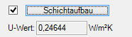 Der berechnete U-Wert des Schichtaufbaus wird im Eingabefeld "U-Wert" angezeigt. Das Feld wird als "nur lesend" angezeigt. Die Markierung der Auswahlmarke links zu der Schaltfläche "Schichtaufbau" bestätigt, dass dar angezeigte Wert aus der entsprechenden U-Wert Berechnung des Schichtaufbaus hervorgeht.
