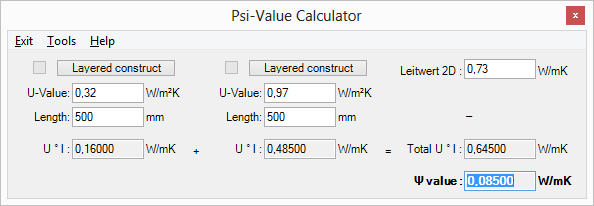 The Psi-Value Calculator is used for rapid calculation of the thermal heat bridge "correction" factors Psi (Ψ) resulting from the input of U-values and lengths specific to the building component concerned and its thermal coupling coefficient L2D as calculated within appropriate two dimensional, stationary, thermal heat bridge simulation software. Calculating U-values needed is supported by the U-value Calculator integrated within this Psi-Value calculation tool.