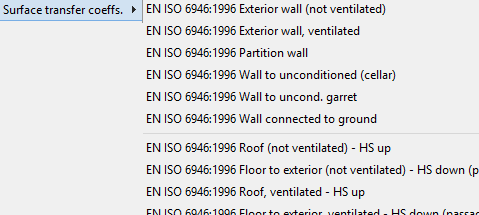 Edit→ Surface transfer coeffs→... | Provides a choice of normative standard values of surface transfer coefficients designed for interior and exterior surfaces. The list offers standard value pairs from EN ISO 6946:1996 and EN ISO 13788:2002. |
