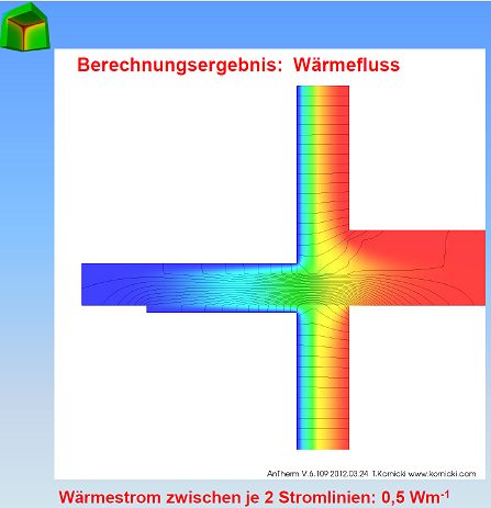 Partition wall of stud framing gypsum plaster placed directly onto the 30cm thick concrete ceiling above basement garage, without thermal insulation on the cold side. The EPS heat insulation layer (Röfix 831, zementgebundene Polystyrolflocken) of 13,5 cm thickness has been placed solely on top of the concrete plaster - there is no other heat coating at the bottom side of the ceiling. The typical cross section of this ceiling construction has been assessed being not critical at all. Legend:- color mapped heat flux (flow stream density) (yellow to black: heavy heat bridge impact )